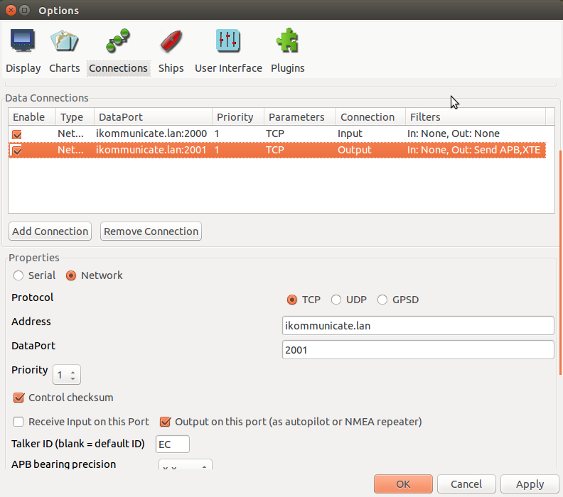 Use UDP if you want other devices to receive the same data as it is a broadcast protocol or use TCP if you want a more reliable and robust “one to one” connection, which is the recommended mode for driving an autopilot. In the screen above, we have created two TCP connections, one for data Input on Port 2000 so that OpenCPN can receive GPS, AIS and Instrument data from iKommunicate, and one data Output on Port 2001 which will carry the autopilot data from OpenCPN to iKommunicate.