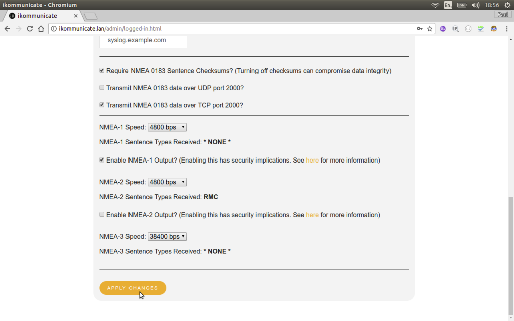 Finally, you need to then set iKommunicate to output TCP data on Port 2000 and to enable it to drive an Autopilot on either Port 1 or Port 2, whichever you are wired up to. This is easy to do through the iKommunicate web interface, which you should be able to access at http://ikommunicate.lan or http://ikommunicate.local depending on how your router is setup or if all else fails by entering the iKommunicate’s IP address i.e. http://192.168.1.80 but using the actual IP address it has on your network.