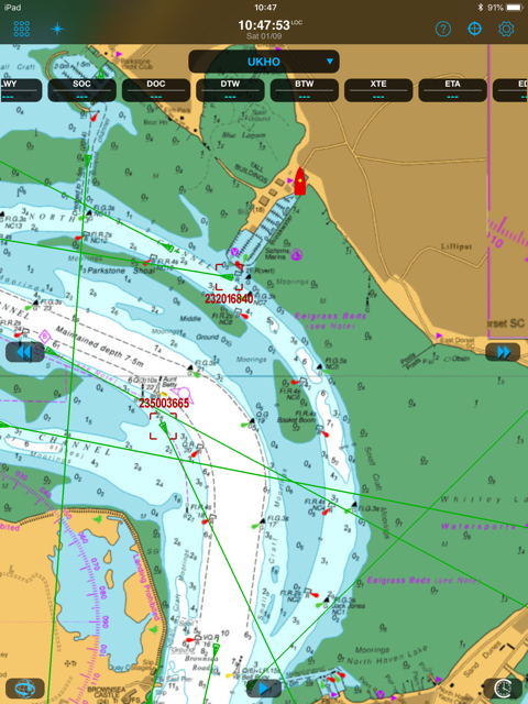Once done, Weather 4D turns into a realtime nav system with GPS and track overlays plus AIS targets, alarms and goto/routing functions. The photo below shows out test boat (in red) moored in Poole and you’ll see the realtime AIS targets with a heading vector overlaid onto the detailed Admiralty chart.