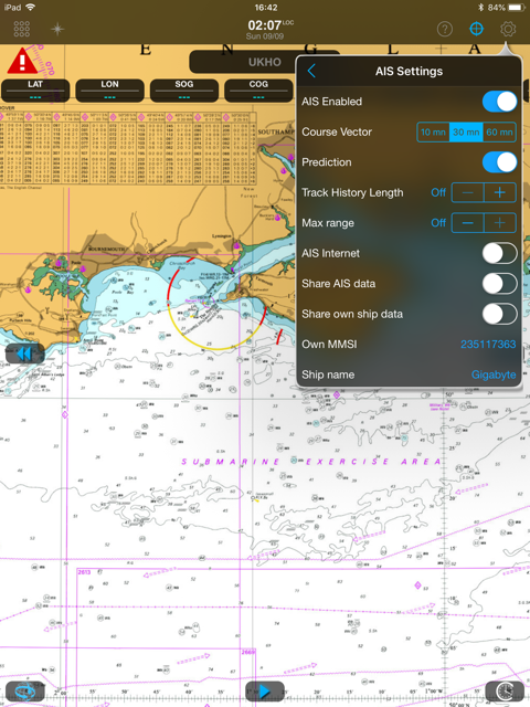 The system also has plenty of AIS options including the ability to overlay internet sourced AIS data. This is dangerous for real-time navigation as there’s often a delay (you’ll see a ship you’ve just passed right in front of you!) or coverage can be poor but it’s fun for use at home looking at other ports or checking on your vessel’s AIS status. You can also optionally set the iPad to upload your local AIS data to the internet if you want to be part of the crowdsourced data gatherers. This can also include local wind data which will offer real-time data to other users – interesting!