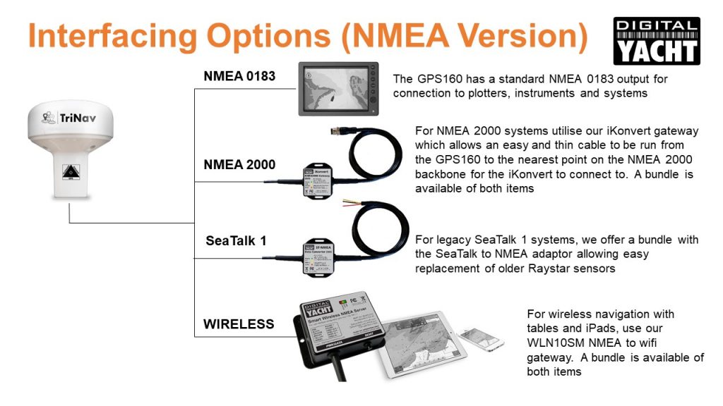 The GPS160 is available with a NMEA 0183 output (4800, 38400 and 115200 baud programmable) and a USB variant for PC, MAC and Linux. For NMEA 2000 systems, a bundle is available with a Digital Yacht iKonvert NMEA 2000 gateway allowing easy and flexible NMEA 2000 installation without the need for cumbersome drop cables.
