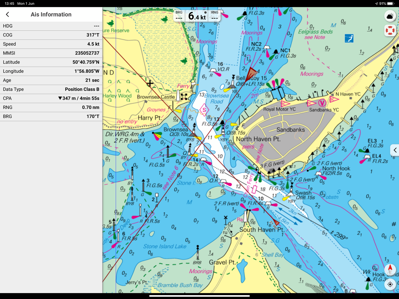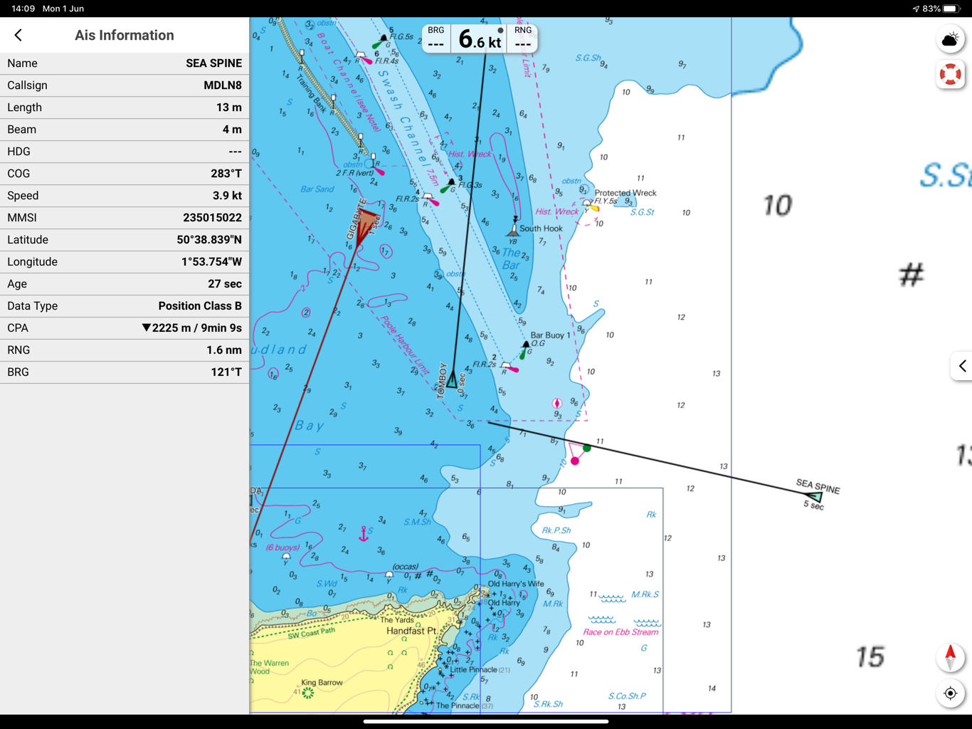 Just enable AIS and targets display automatically. You’ll see the target just to the east of South Haven Point with a heading predictor showing a potential collision point. Click on the target and more information is displayed in the data window – also calculating CPA (closest point of approach) and TCPA (time to CPA), range and bearing.