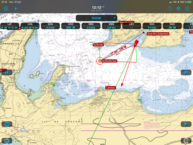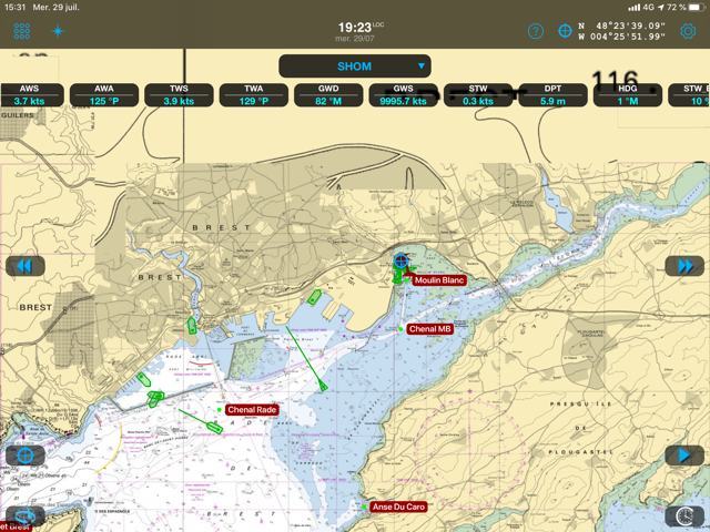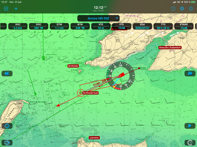 You can see the yacht underway in the screen shot below. Note how there’s a wind data instrument display attached to the boat’s icon. Therefore allowing you to instantly and easily assimilate all the boat data at a glance. You can download weather data as an animated forecast from the web. On the same display, there’s an overlay of wind data. You can also have barometric pressure, wave and temperature information as well as AIS and GPS position.