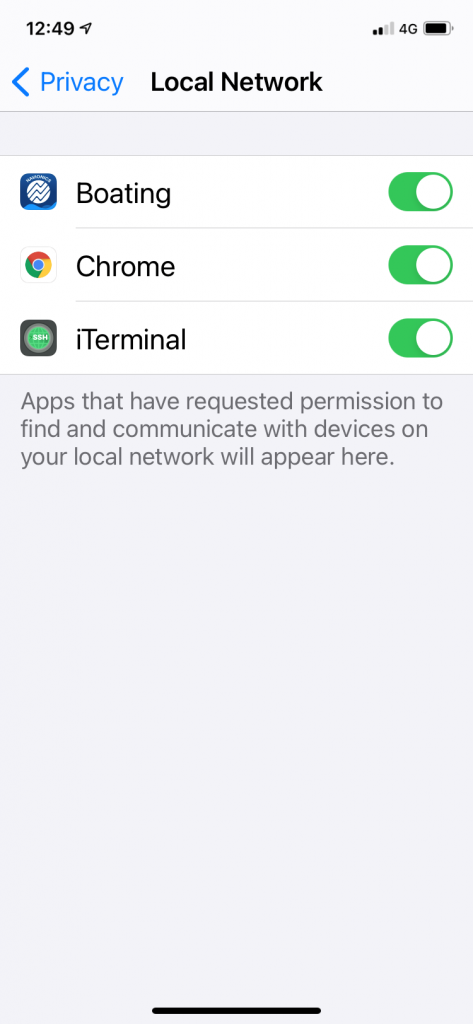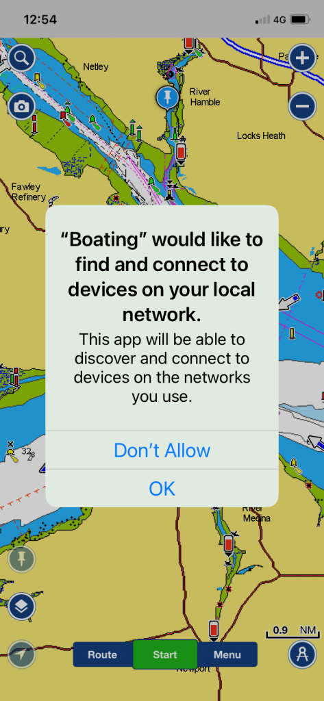 Similar to allowing an app to use “Location Services” or the “Camera” this new feature creates another potential barrier to your apps accessing the wireless data from our AIS and NMEA devices.