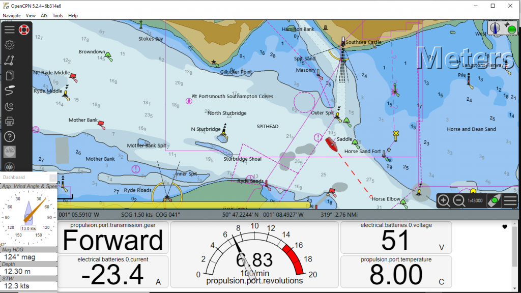 In the meantime, you can use the very flexible “Instrument Panel” web app that is included with the Signal K Server, to add extra displays to supplement those already supported by OpenCPN. The screen shot below, shows a normal OpenCPN display, with the Gauges populated with data from the NMEA 2000 network, plus some extra Instrument Panels below the OpenCPN window, showing the status of a Vetus E-Line 10KW 48v Electric Engine.