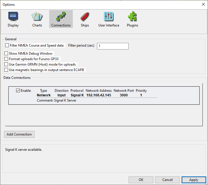 To setup OpenCPN to use the Signal K service, go to Settings>Connections in OpenCPN and add a new Network connection.