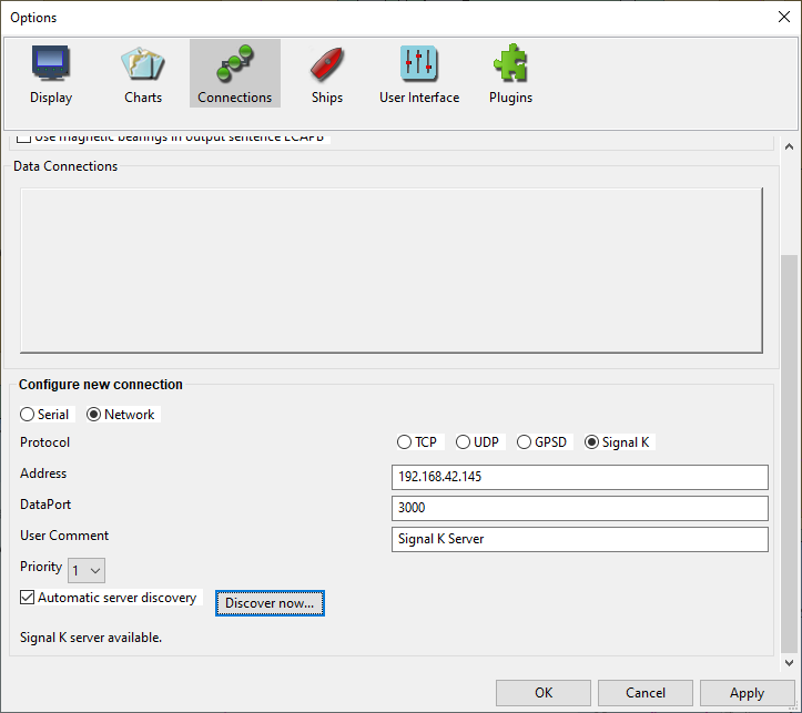 Enter the Address of your PC and port 3000, which is the default for the Signal K Server and give the connection a meaningful name in the User Comment box. You can also tick the Automatic server discovery and click the “Discover now” button. You should see the message “Signal K server available” appear.