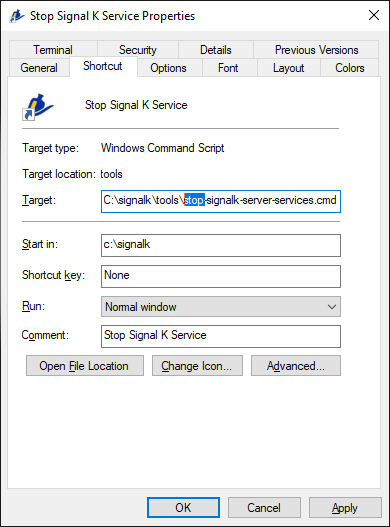 I also created a third one to Stop the Signal K Service, by making a copy of the Start Signal K Service and then changing the Properties to run the Stop Signal K Service program.