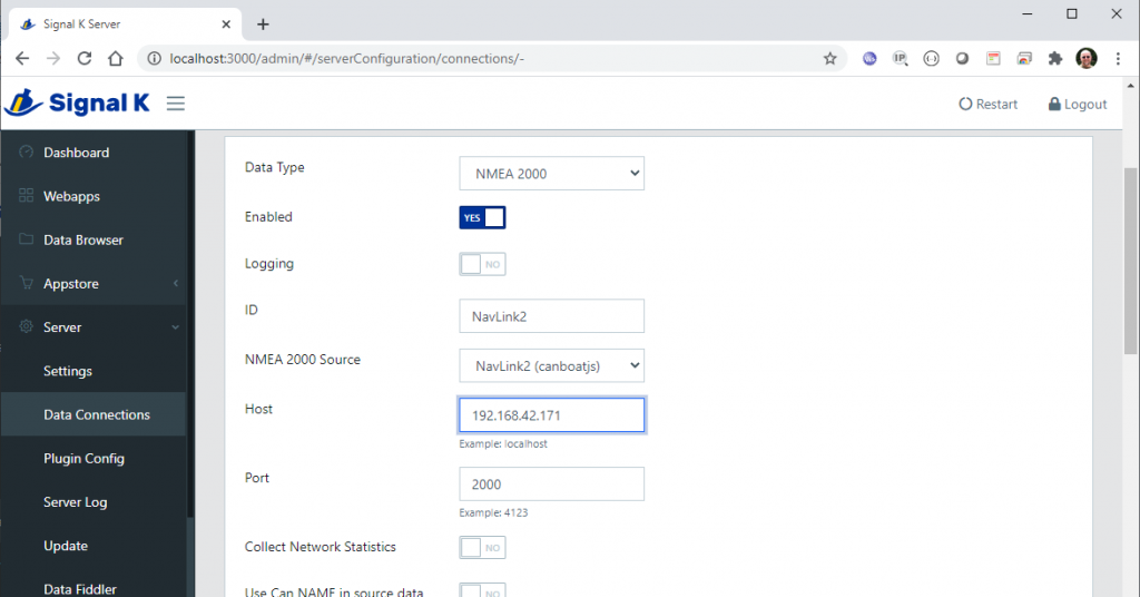 Now Restart the Signal K server and you should see a new Data Connection, called NavLink2 or whatever ID you gave it, in the top right corner of the Dashboard. Your setup of the NavLink2 is now complete and you can proceed to the Setting Up OpenCPN section.