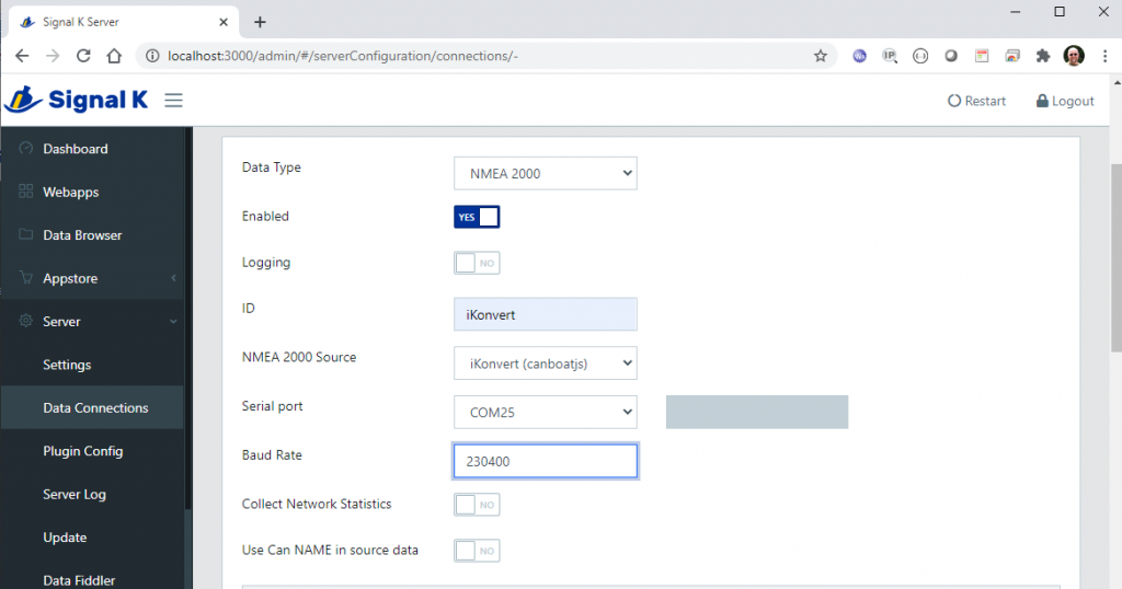 The following procedure takes you through the setup of your iKonvert as a Signal K Data Connection….
