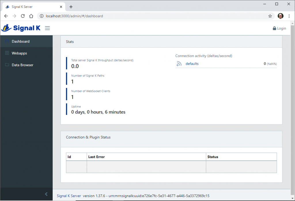 After about 10-20 seconds, you should be able to click on the “SignalK-GUI” shortcut and Windows should open a web browser and display the Signal K Server’s web interface (Dashboard).