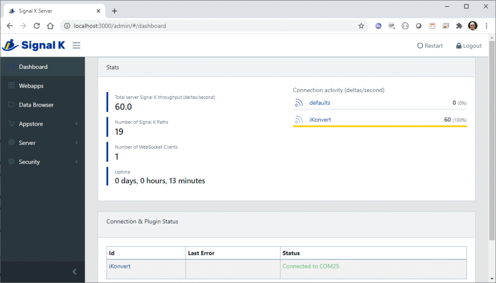 Now Restart the Signal K server and you should see a new Data Connection, called iKonvert or whatever ID you gave it, in the top right corner of the Dashboard. Your setup of the iKonvert USB is now complete and you can skip down to the Setting Up OpenCPN section.