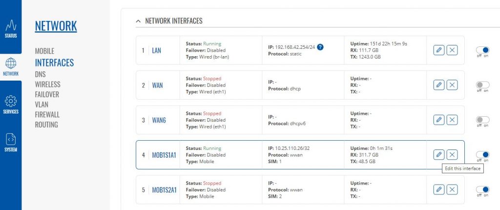 - Now go to NETWORK>INTERFACES and click on the Edit button (pencil icon) of the SIM card interface you are using, SIM 1 in the example below.