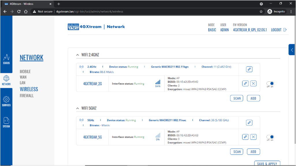 The 4G Xtream has two built-in WiFi network (2.4 Ghz and 5 Ghz). One wifi network can be used to access a shoreside hotspot (2.4GHz). The 4G Xtream has a 3 x LAN ports and 1 x WAN port. All ports work up to 1000Mb/s (1 Gigabit).