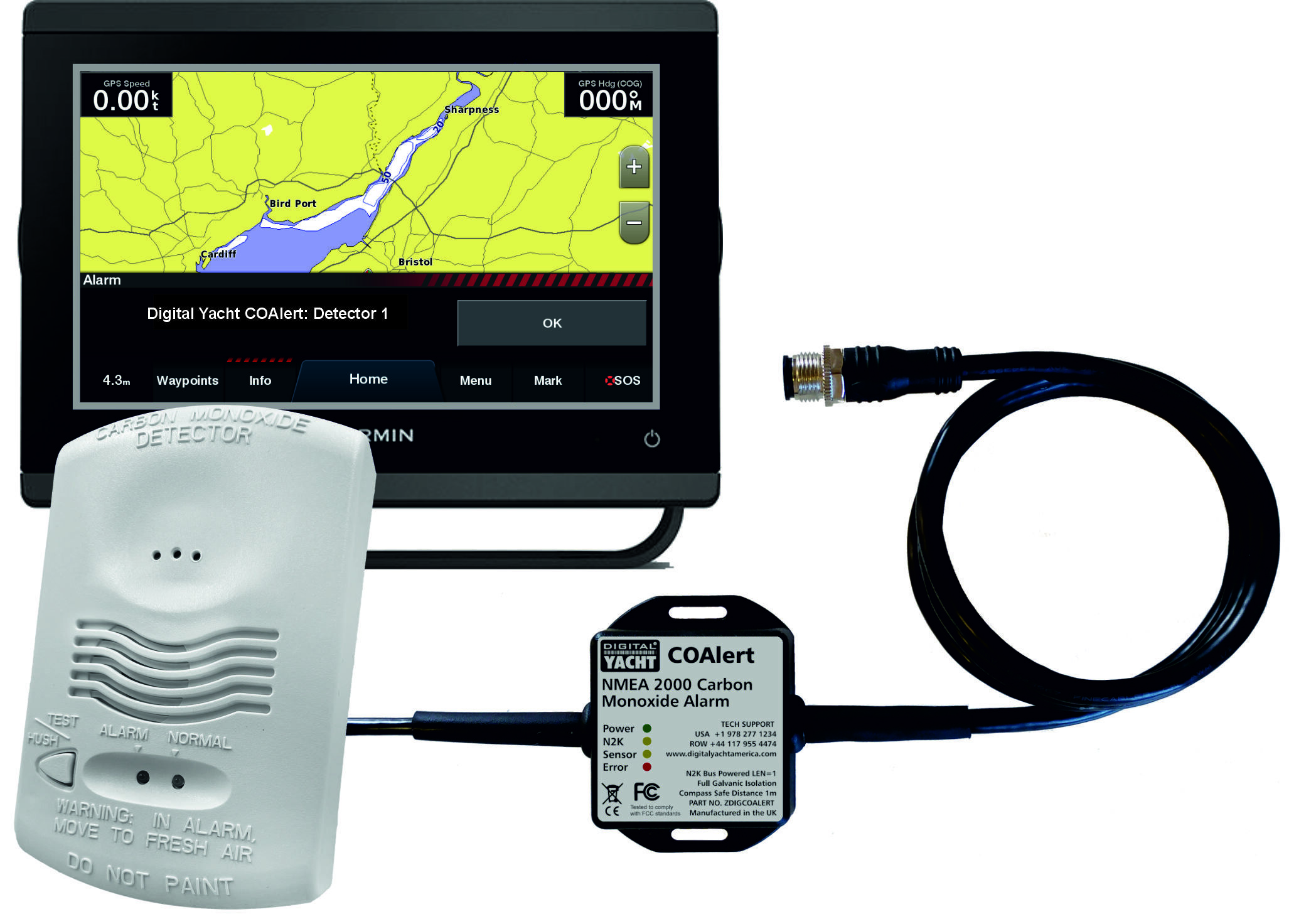 CO Alert from Digital Yacht is built for demanding maritime environment. In addition, it has an NMEA 2000 cable, creating a standard NMEA 2000 alert PGN that allows these alarms to appear on compatible MFDs.