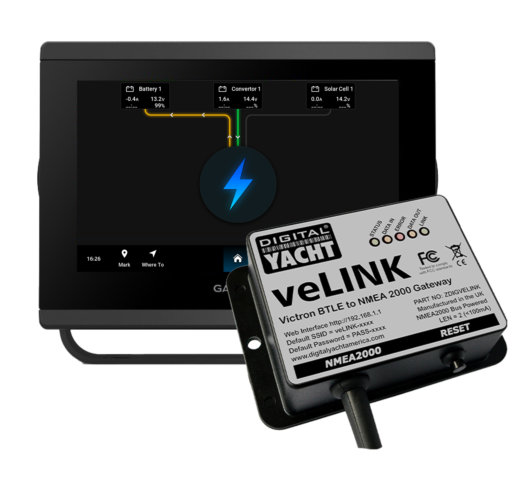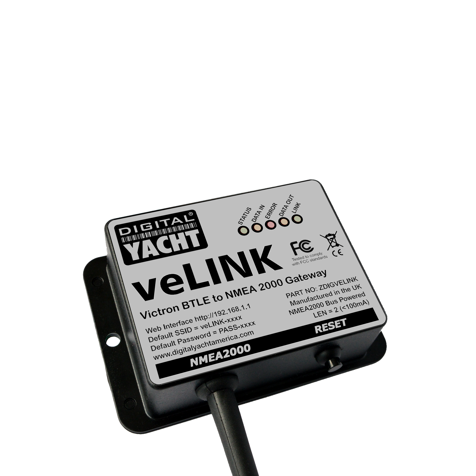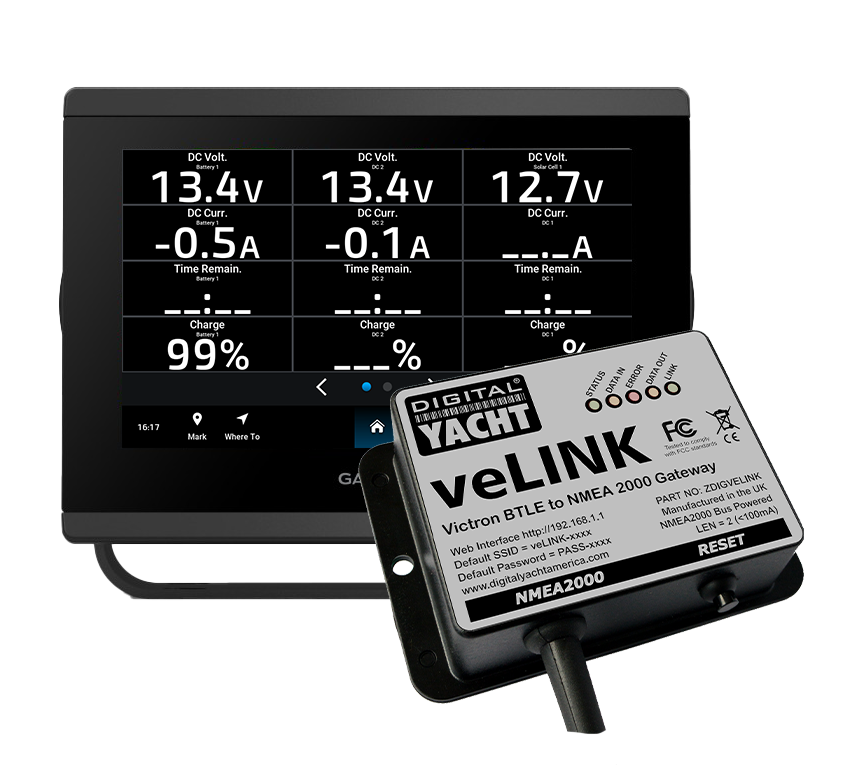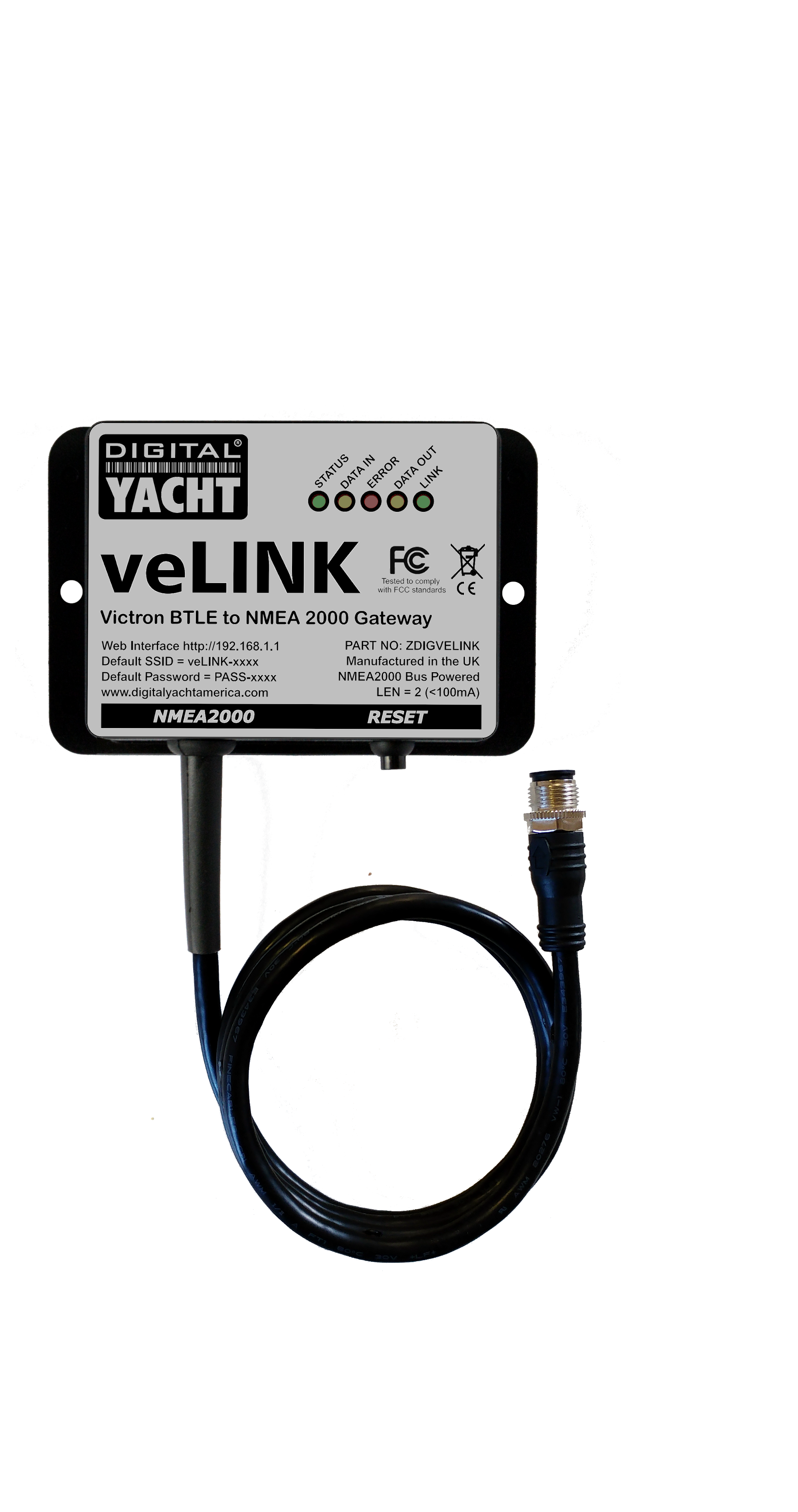 veLINK is a new Bluetooth wireless interface from Digital Yacht that links compatible Victron Bluetooth battery chargers, monitors, shunts, solar regulators and converters to your boat’s NMEA 2000 network.