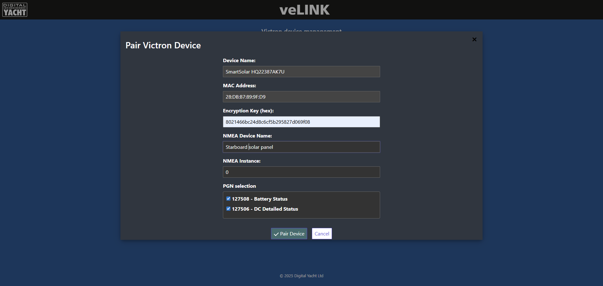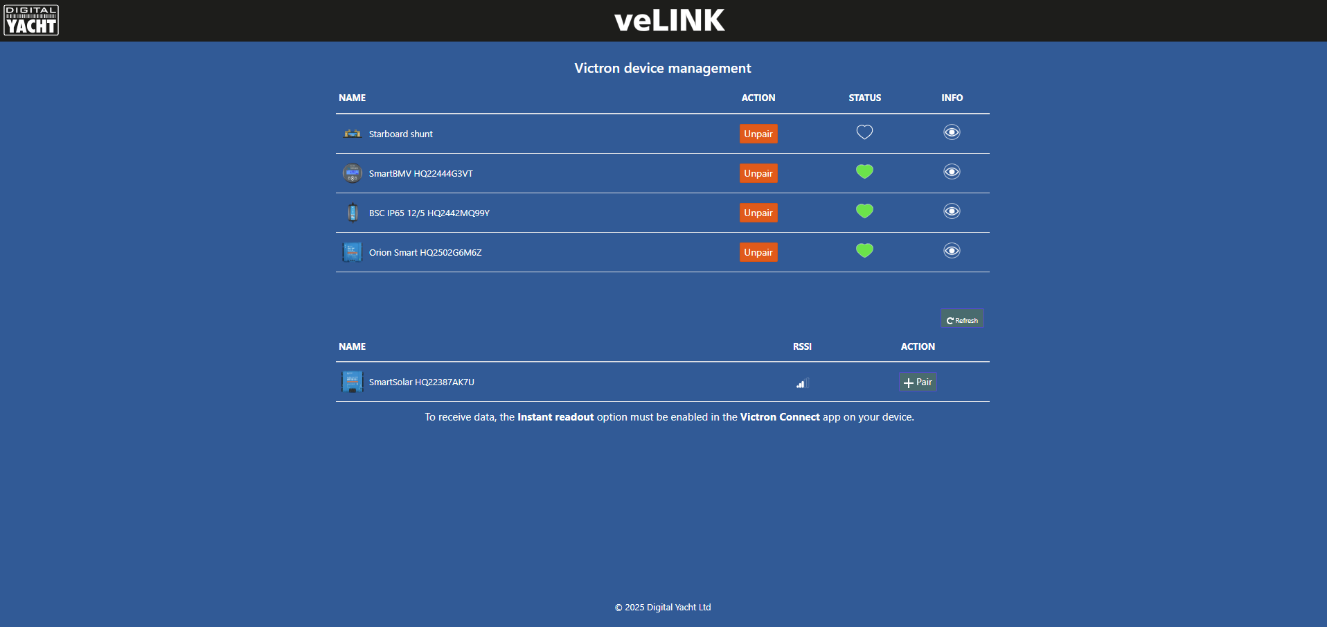 veLINK supports up to eight Victron devices. Users can configure individual network “instances” so each device appears separately on the multifunction display and can assign custom names for easy identification and monitoring.