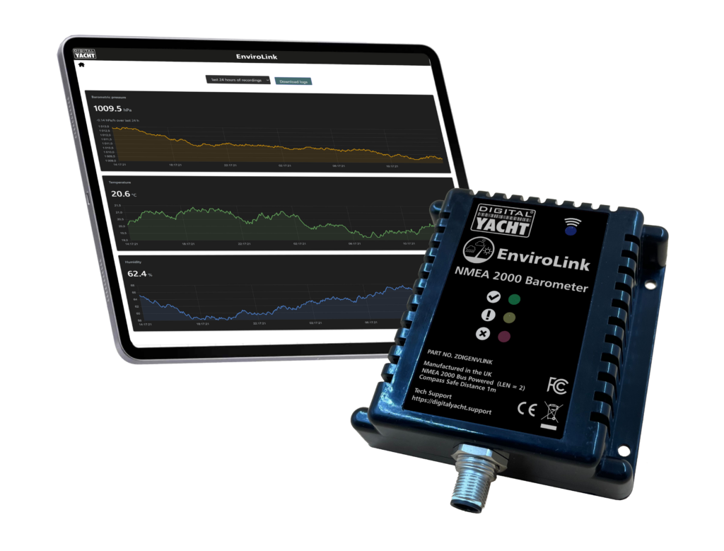 Digital Yacht’s EnviroLINK device brings traditional barometric pressure, temperature and humidity monitoring to the digital age with NMEA 2000 connectivity for your multifunction display (MFD) as well as wireless smart phone and tablet connectivity. MFDs are offering more and more capability thanks to NMEA 2000 connectivity so one display on the boat can become an information hub.