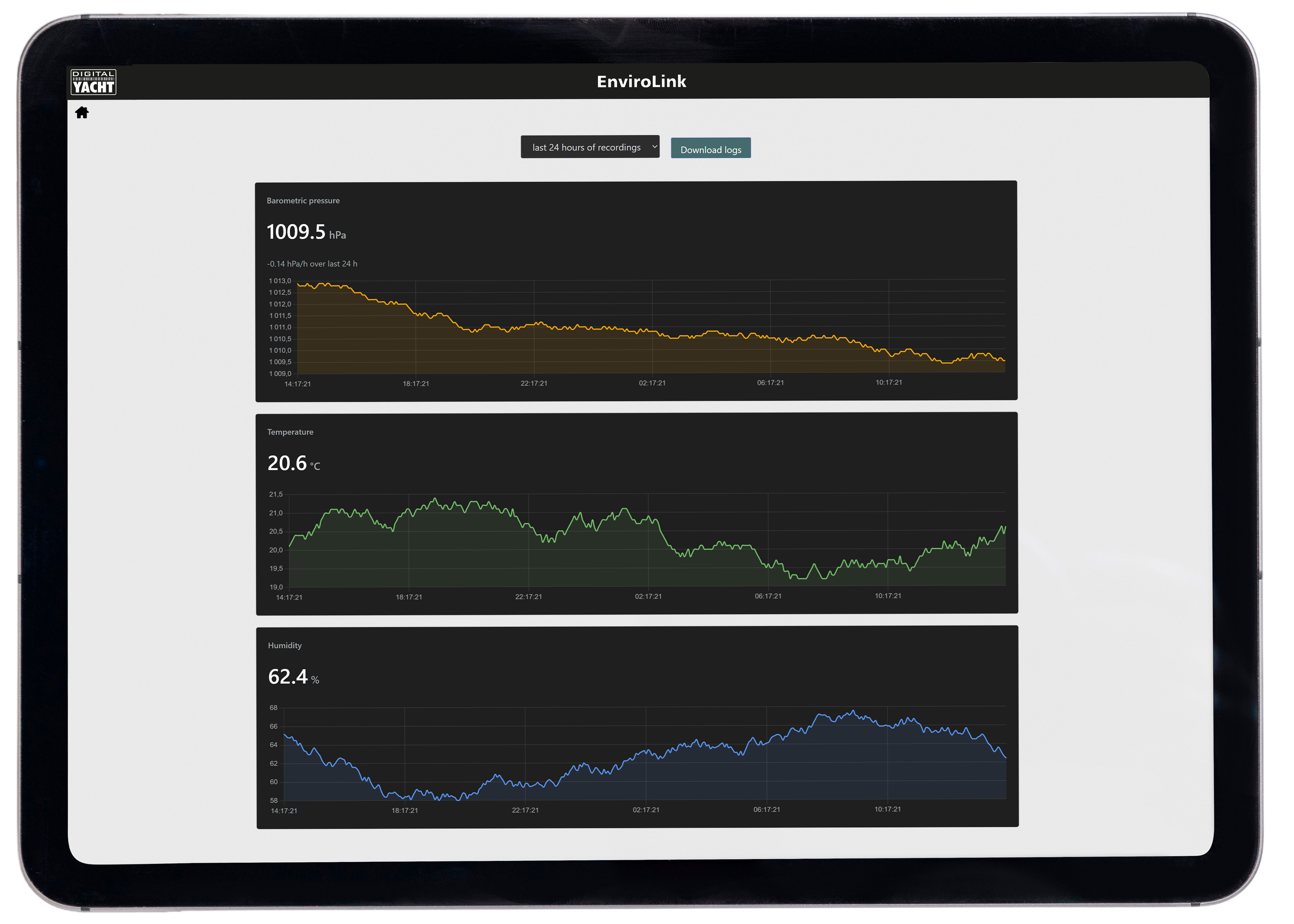 Trends in temperature and humidity are also recorded. Data is collected and stored locally using a precision sensor so there’s no internet connection needed and no proprietary apps require installing. EnviroLINK operates autonomously on your boat providing the best insight to local weather.