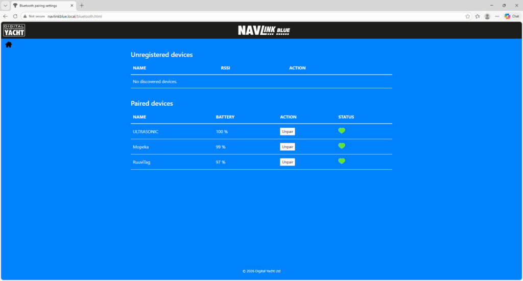 Once the Calypso Ultrasonic Wireless Wind Sensor is paired via Bluetooth, you can check its status and battery level through the Navlink Blue web interface.