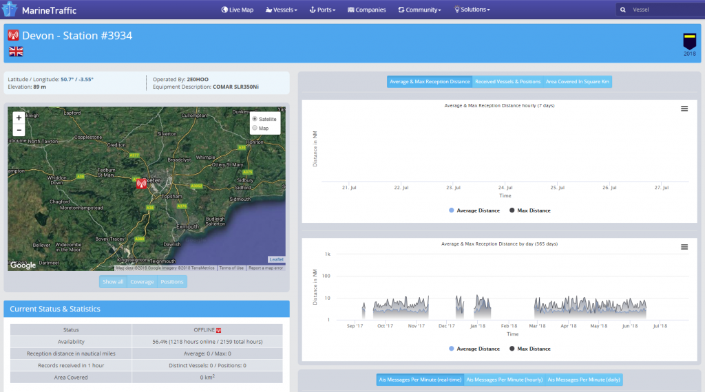 Another nice feature of Marine Traffic, is that you can drill down in to the details of a particular receiving station. Click on the icon of the Station of interest and a summary of the receiving Station’s information will be displayed. By clicking the Green “Details and Statistics” button, you can get a wealth of information about the station, its statistics and “live” AIS target reception list.